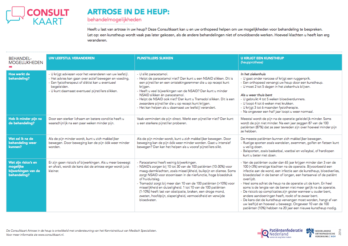 Wij snappen dat u soms door de bomen het bos niet meer ziet. Daarom heeft de Nederlandse Orthopedie Vereniging (NOV) een handig hulpmiddel bedacht. Deze is tot stand gekomen in samenwerking met orthopedisch chirurgen en patiënten verenigingen. In een beknopt overzicht worden de diverse behandelingen van artrose én de voor- en nadelen daarvan uitgelegd. Voordat u bij de orthopedisch chirurg of verpleegkundig specialist komt is het handig om dit eens door te lezen.