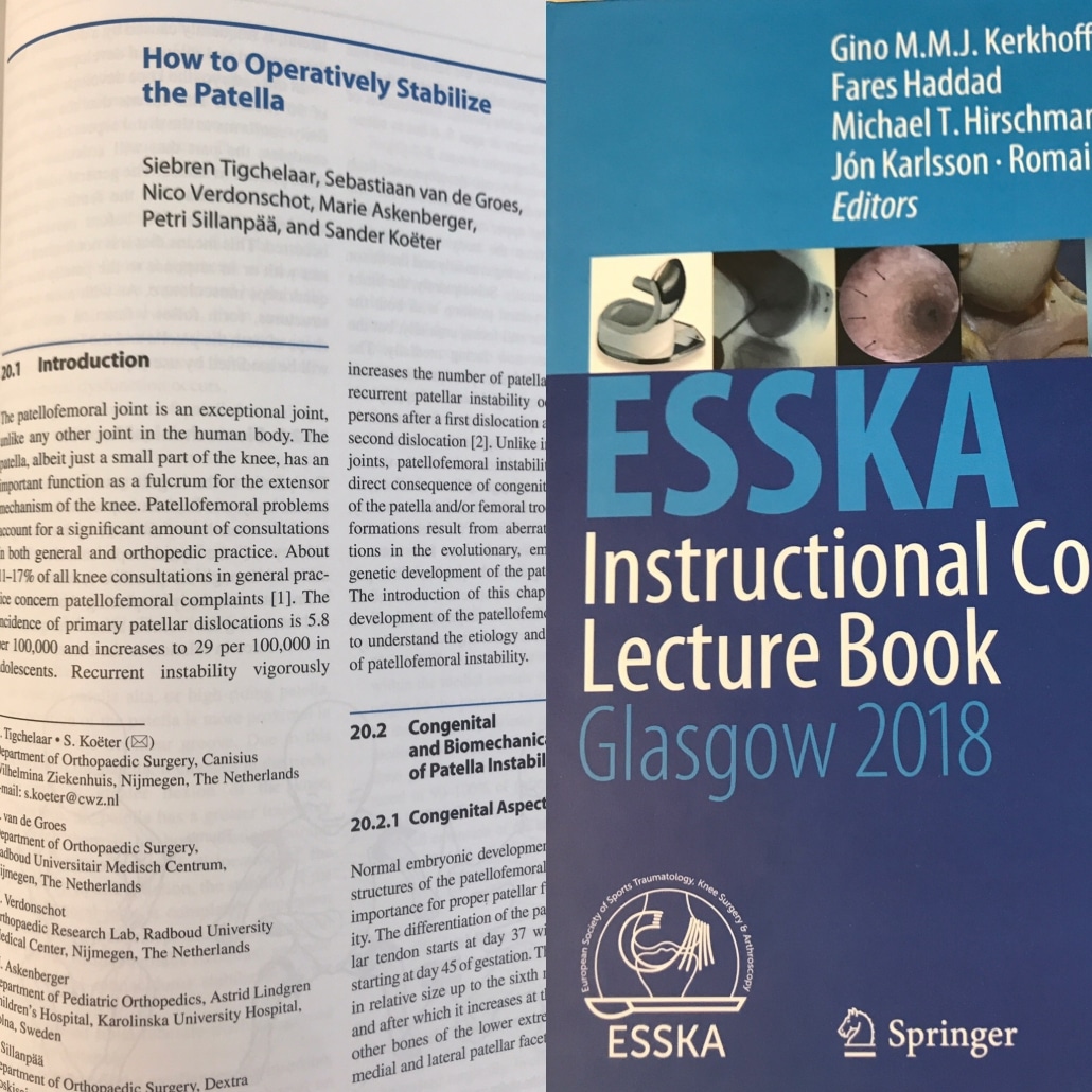 Tijdens Europees orthopedisch congres 2018 in Glasgow verzorgde dr. Tigchelaar en dr. Koëter enkele presentaties over patellofemorale aandoeningen voor collega’s. Nu is hun expertise ook terug te lezen in een internationale boek over deze aandoeningen. Hierin hebben ze allebei meegeschreven aan een hoofdstuk over operatieve behandelingen van knieschijf problemen. Orthopedie Nijmegen is trots op deze prestatie en laat hiermee zien de opgedane kennis en ervaring binnen ons expertisecentrum te delen met nationale en internationale collega’s.