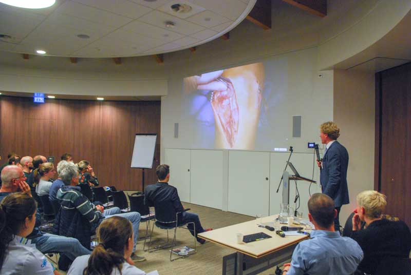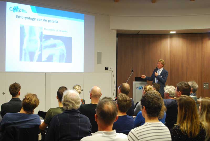 De avond werd gestart met een korte presentatie van de patient door dr. Tigchelaar. Nadat hij met zijn team naar de operatiekamer vertrok, nam dr. Koëter het publiek mee in het ontstaan van patellofemorale klachten, de diverse behandeling mogelijkheden en resultaten daarvan. Ondertussen werd regelmatig verbinding gemaakt met de operatiekamer waarbij de operatie ook live te zien was. Na de pauze volgden een korte presentatie van oud cwz-orthopeed dr. van Norel over zijn bijzonder goede werk in ontwikkelingslanden. Hij liet zien hoeveel kinderen hij daar regelmatig kan opereren of behandelen en zo weer een toekomst kan geven! Vervolgens sprak AIOS orthopedie Jordy van Sambeeck over de fysiotherapeutische nabehandeling na de operatie en sprak Sander Koëter met een patient zodat ook het perspectief op de operatie en nabehandeling van de ervaringsdeskundige eens gehoord kon worden.